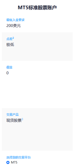 MT5标准股票账户支持0佣金和极低点差交易包括特斯拉,苹果,脸书等超600多支美股产品。除了超低价格之外,此账户还使用市场执行方式来执行订单——意味着您将立即获得当前市场的最佳价格。